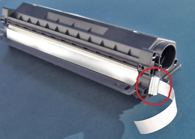 Here, the seal exit port plug is shown circled with a HP 1200 silver seal andtoner hopper.