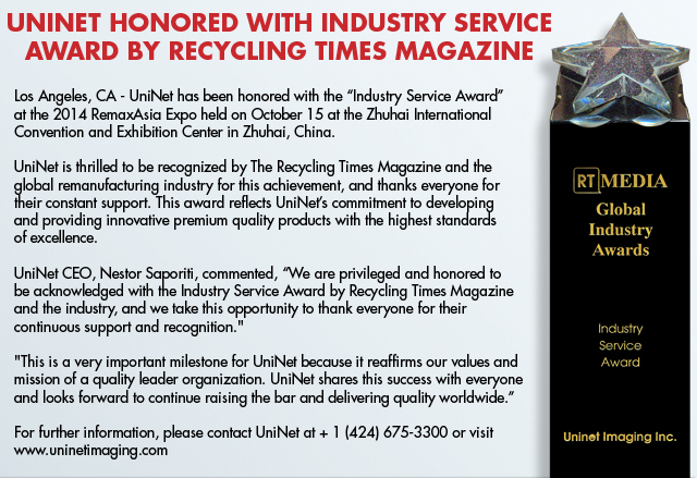 October 2015 UniNet Wins RT Media Global Industry Service Award (Source: www.irecyclingtimes.com article)